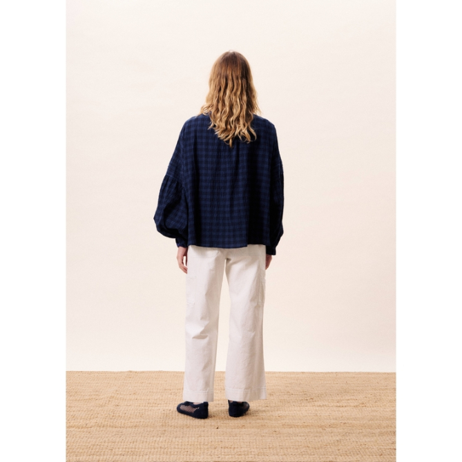 Blusa Abullonada con detalles de encaje y estampado de cuados.