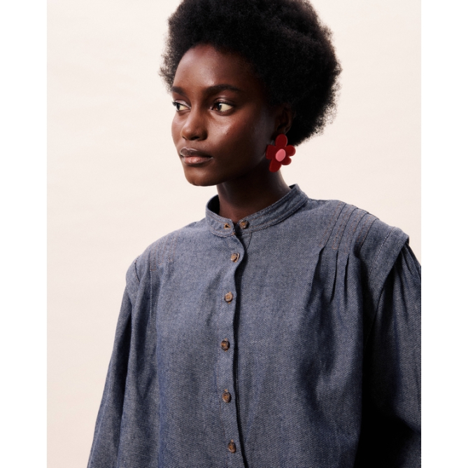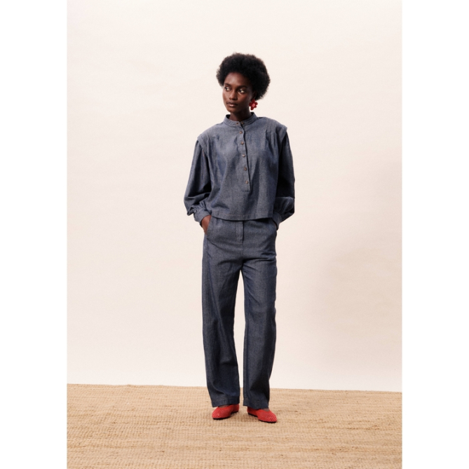 Camisa de manga larga y cuello mao. Detalle en los hombros. y manga abullonada.