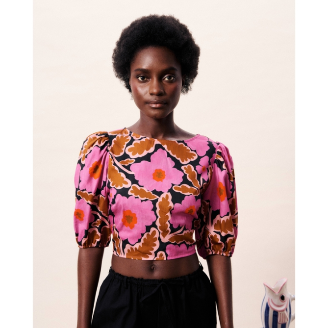 Top con mangas cortas y abullonadas. Anudado en la espalda.