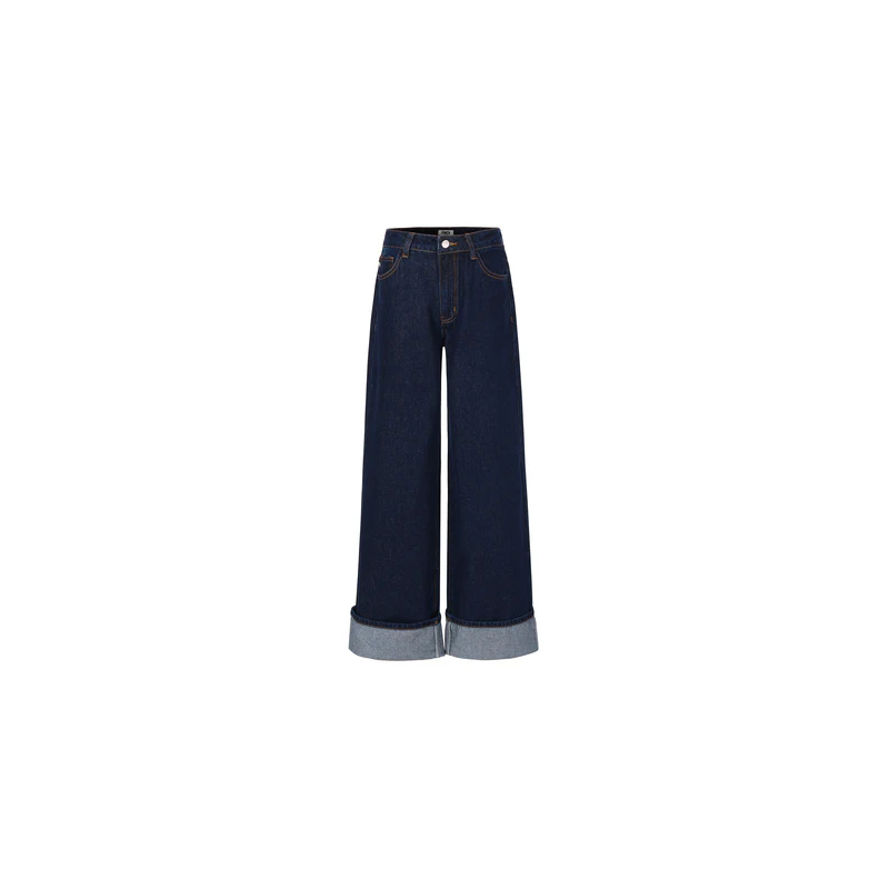 Pantalón ancho con vuelta ancha en el bajo. Detalle de dibujo en los bolsillos traseros.