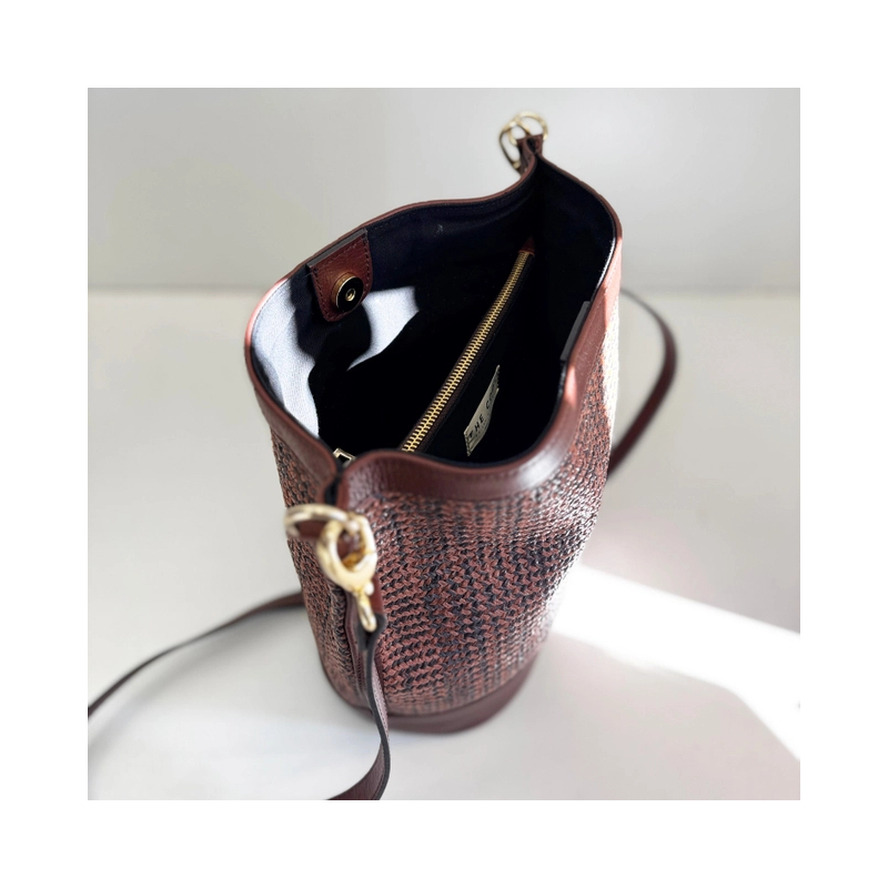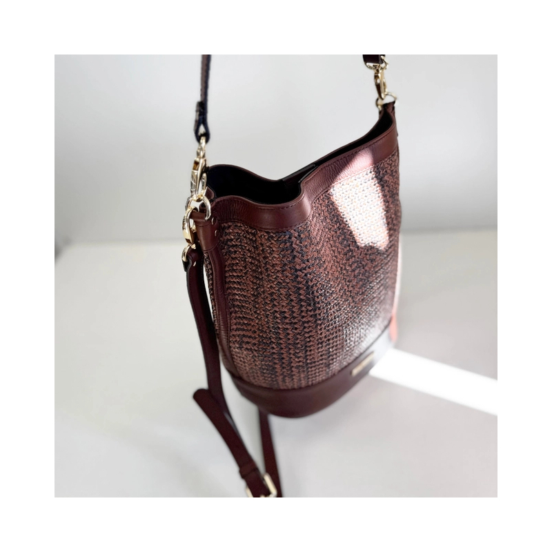 Bolso tipo bombonera de piel y rafia con doble asa ligero y práctico . - Cierre de imán y cremallera en el interior - Color: rafia en tono chocolate y negro y piel 100% vacuno color marrón chocolate -Interior: totalmente forrado con doble compartimento ybolsillo con cremallera en el centro